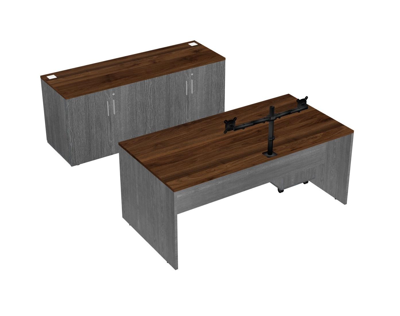 Columbia Walnut Office Parallel Desk With Storage Cabinet + Wooden Mobile Drawers + Monitor Arm (double Arms)