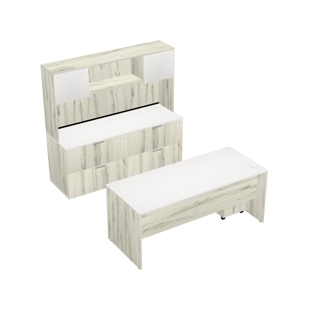 White Office Parallel Desk With Lateral File Cabinet + Wooden Mobile Drawers + Hutch