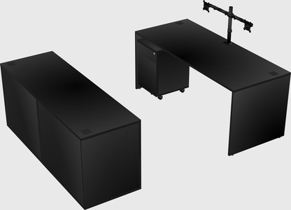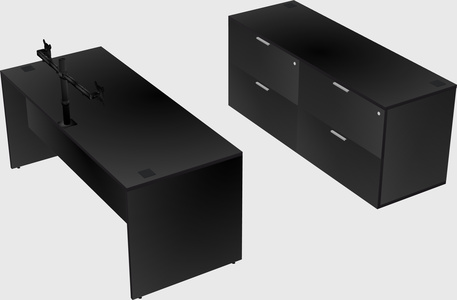 Black Office Parallel Desk With Lateral File Cabinet + Wooden Mobile Drawers + Monitor Arm (double Arms)