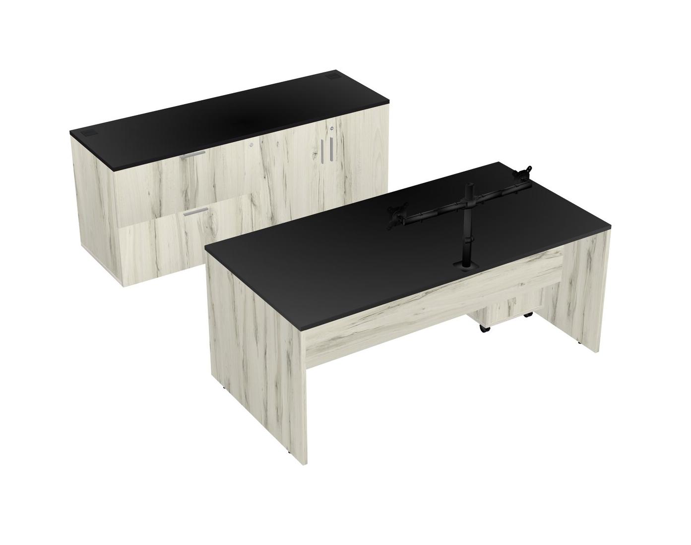 Black Office Parallel Desk With Lateral Storage Combo + Wooden Mobile Drawers + Monitor Arm (double Arms)