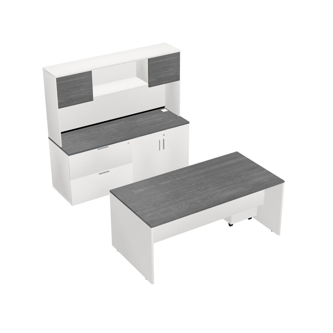 Grey Office Parallel Desk With Lateral Storage Combo + Wooden Mobile Drawers + Hutch