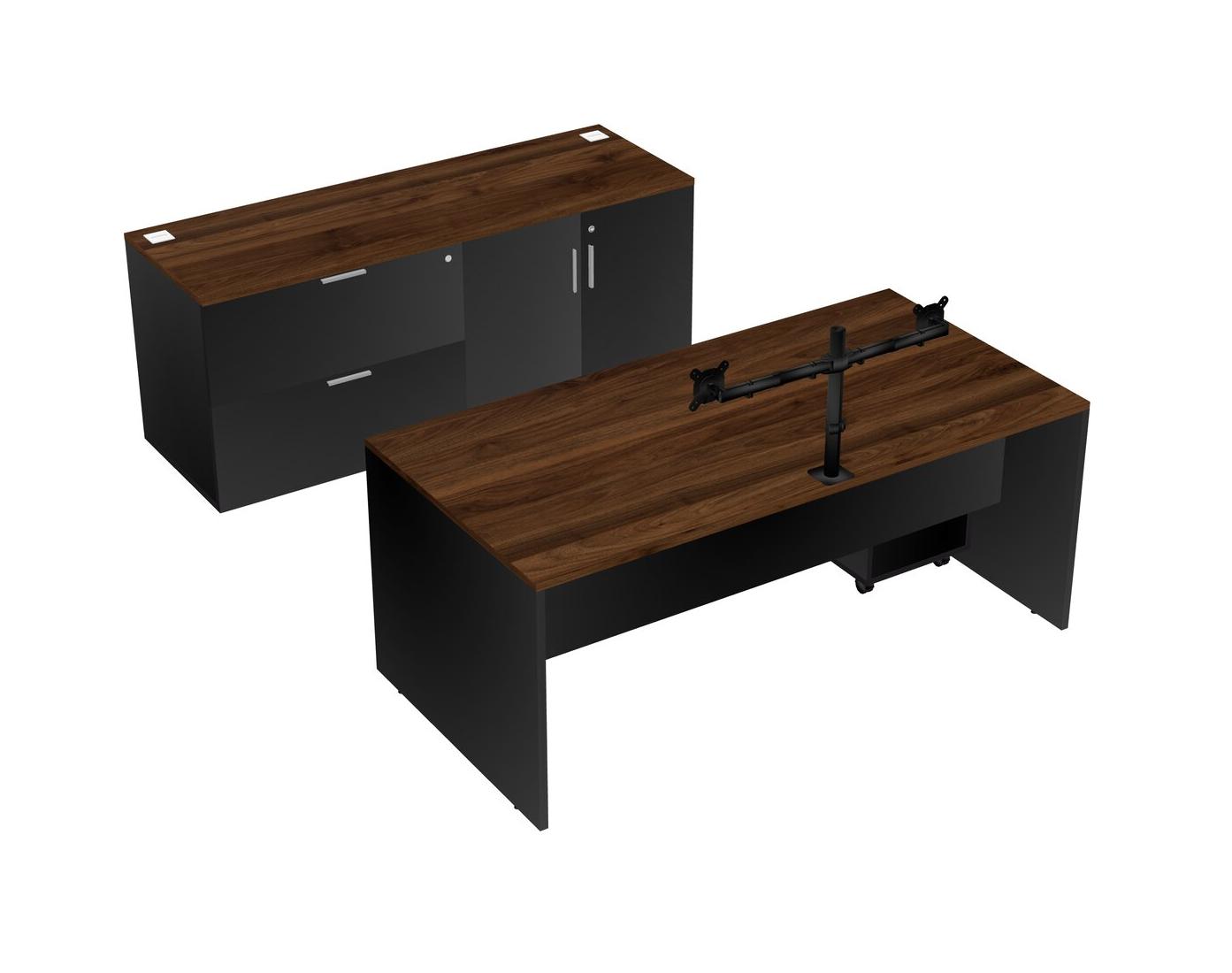 Columbia Walnut Office Parallel Desk With Lateral Storage Combo + Wooden Mobile Drawers + Monitor Arm (double Arms)