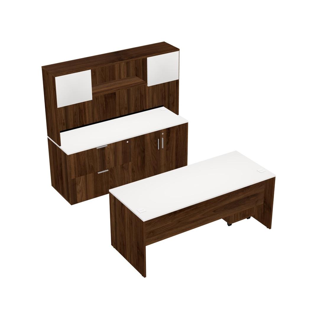 White Office Parallel Desk With Lateral Storage Combo + Wooden Mobile Drawers + Hutch