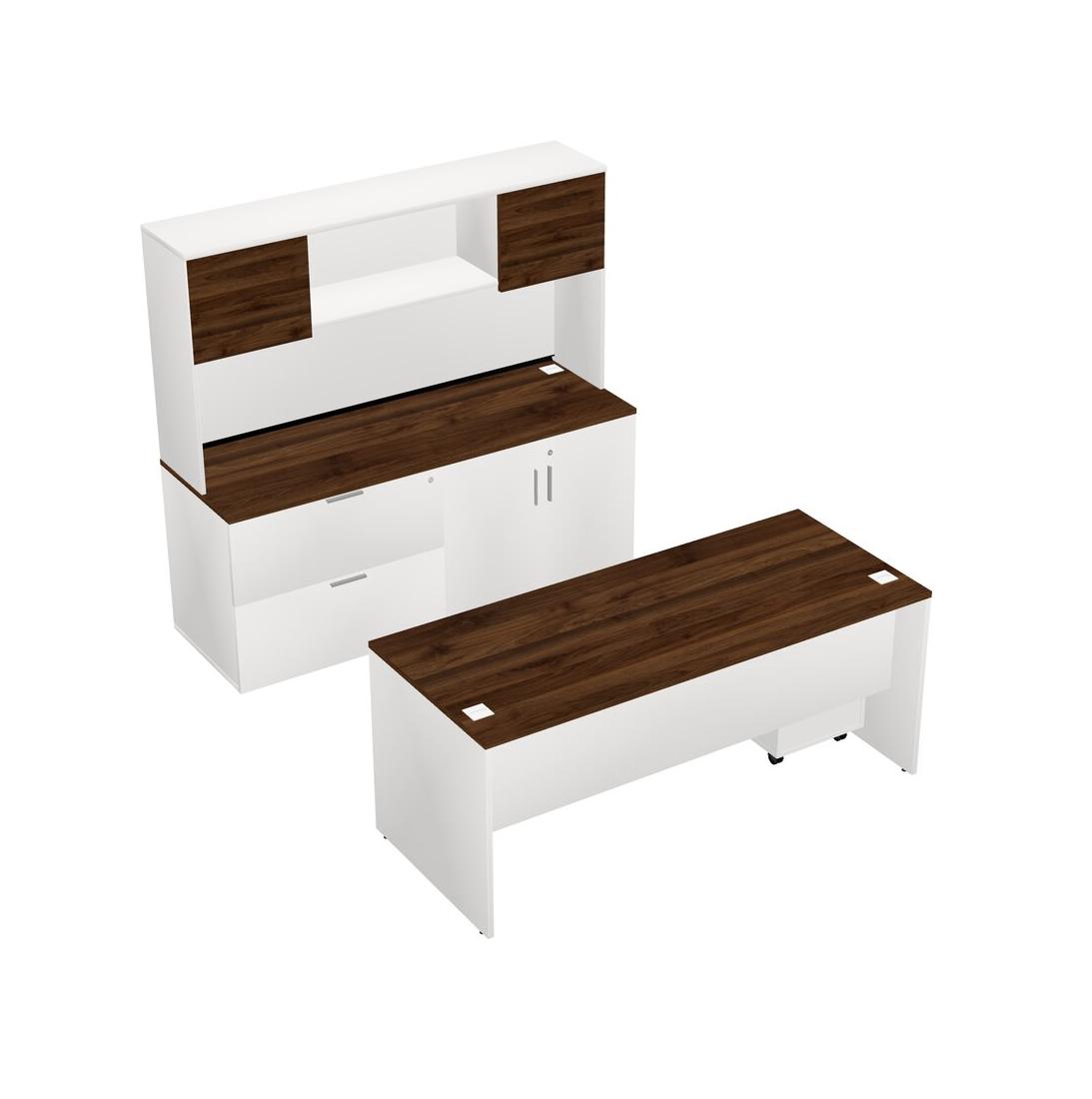 Columbia Walnut Office Parallel Desk With Lateral Storage Combo + Wooden Mobile Drawers + Hutch