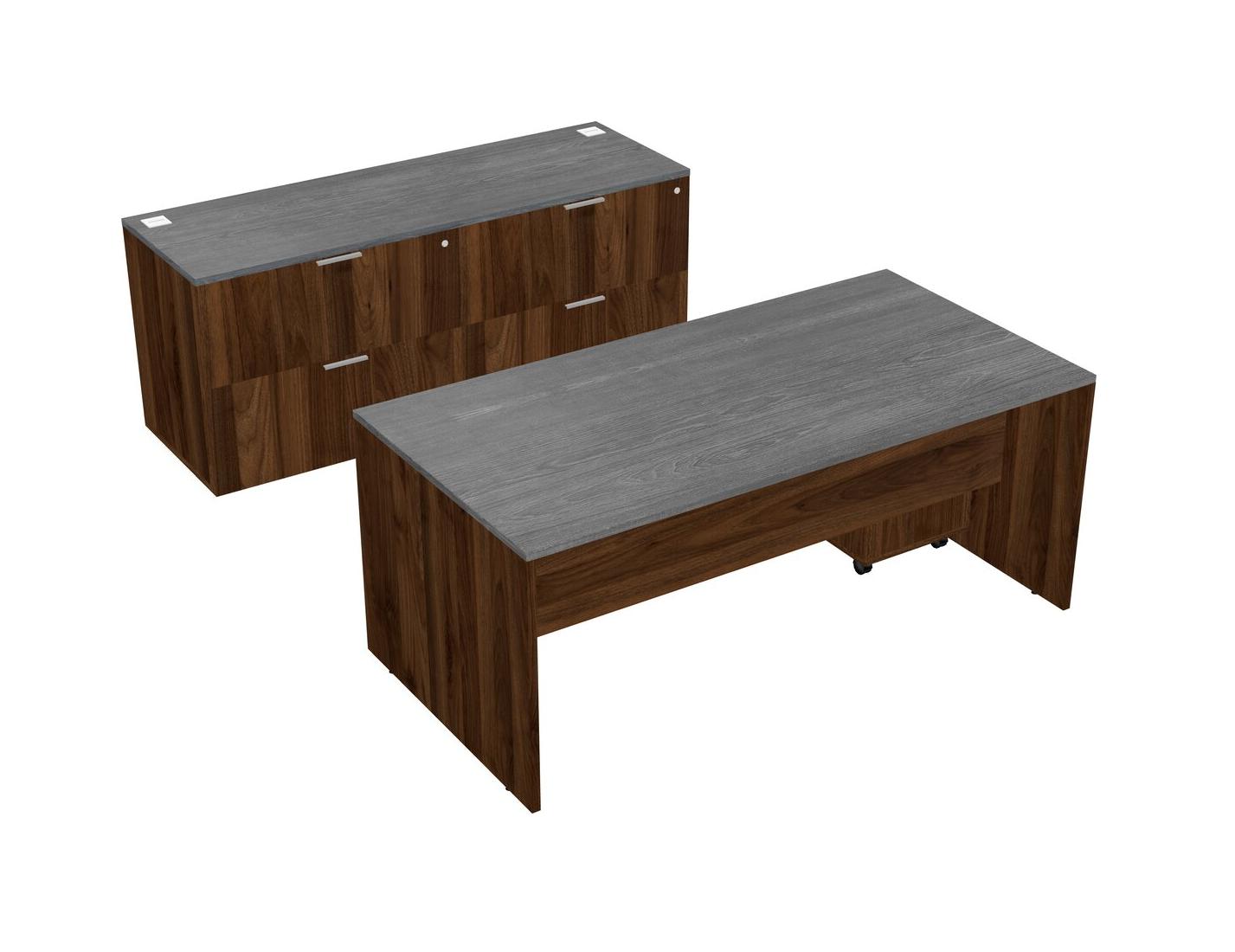 Grey Office Parallel Desk With Lateral File Cabinet + Wooden Mobile Drawers