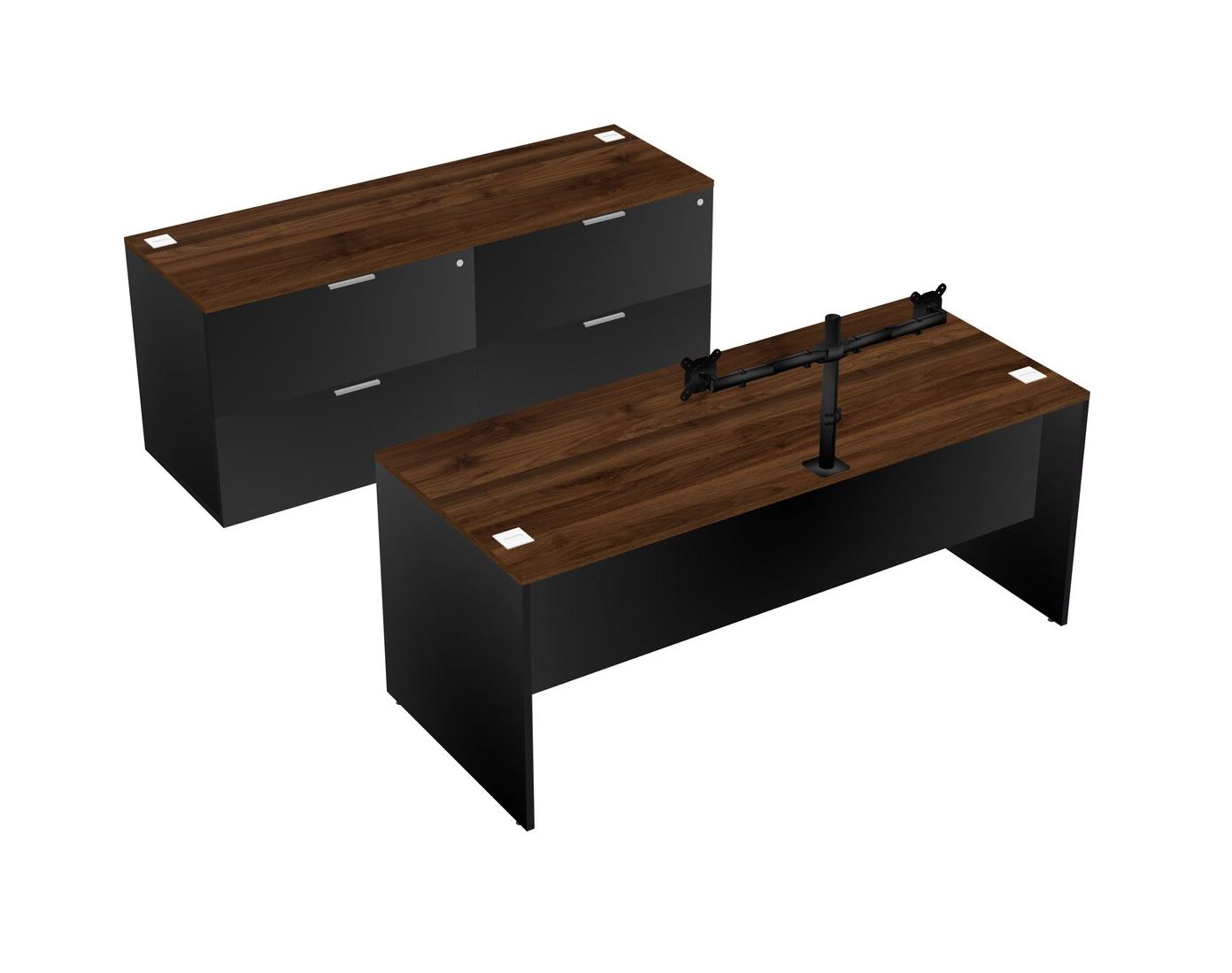 Columbia Walnut Office Parallel Desk With Lateral File Cabinet + Monitor Arm (double Arms)