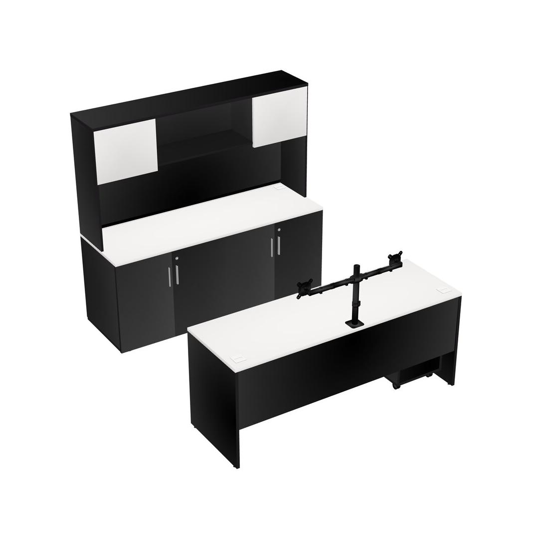 White Office Parallel Desk With Storage Cabinet + Wooden Mobile Drawers + Hutch + Monitor Arm (double Arms)