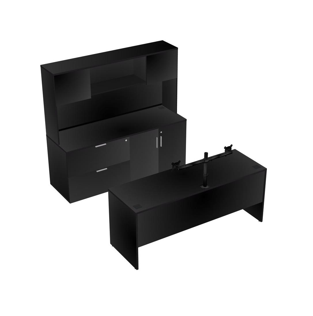 Black Office Parallel Desk With Lateral Storage Combo + Wooden Mobile Drawers + Hutch + Monitor Arm (double Arms)