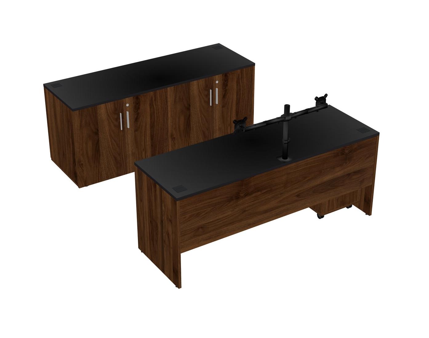 Black Office Parallel Desk With Storage Cabinet + Wooden Mobile Drawers + Monitor Arm (double Arms)