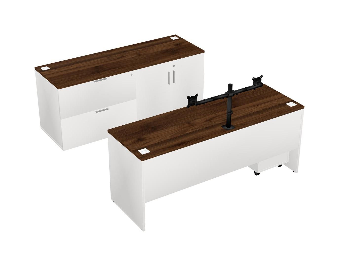 Columbia Walnut Office Parallel Desk With Lateral Storage Combo + Wooden Mobile Drawers + Monitor Arm (double Arms)