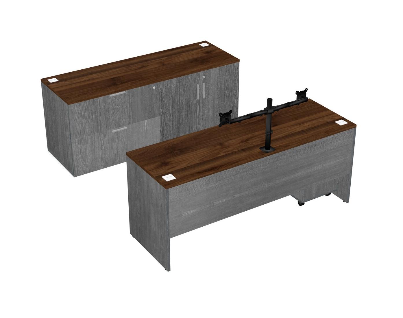 Columbia Walnut Office Parallel Desk With Lateral Storage Combo + Wooden Mobile Drawers + Monitor Arm (double Arms)