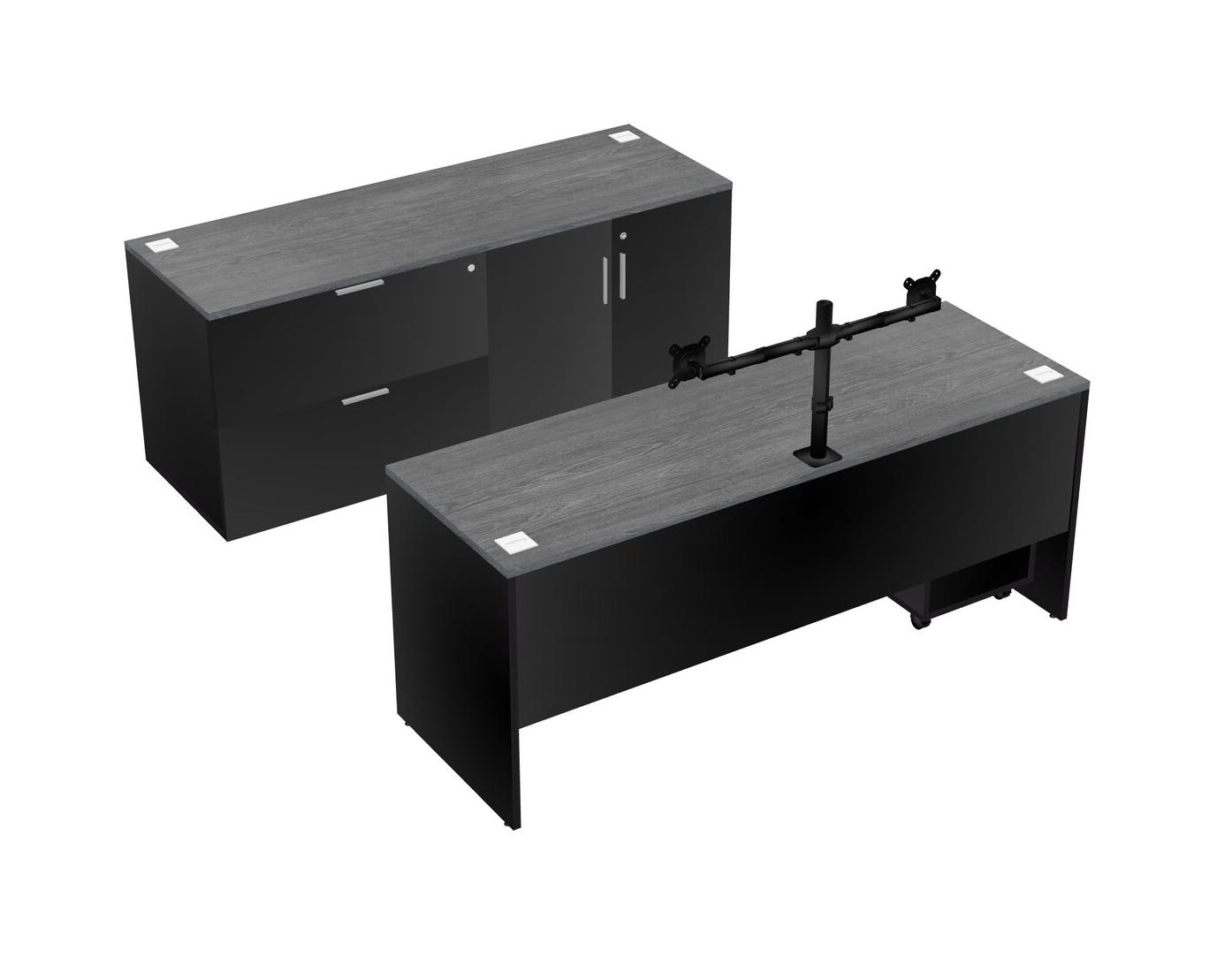 Grey Office Parallel Desk With Lateral Storage Combo + Wooden Mobile Drawers + Monitor Arm (double Arms)
