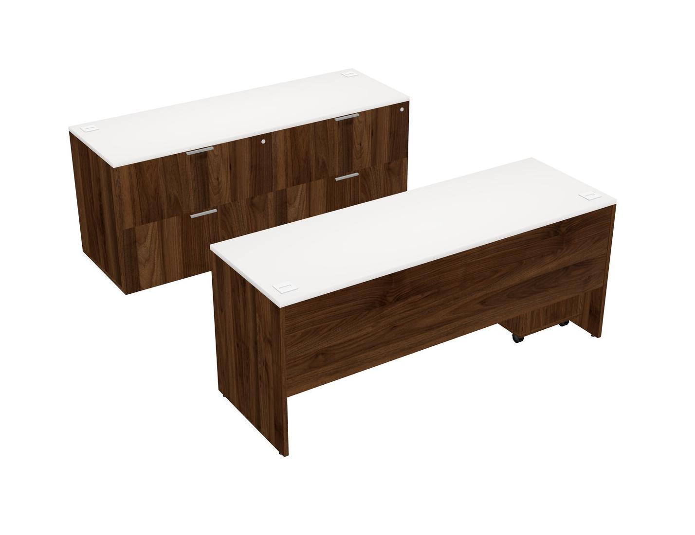 White Office Parallel Desk With Lateral File Cabinet + Wooden Mobile Drawers