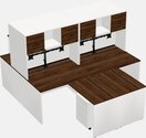Columbia Walnut Quad L-shaped Office Desks With Black Monitor Arm (double Arms)