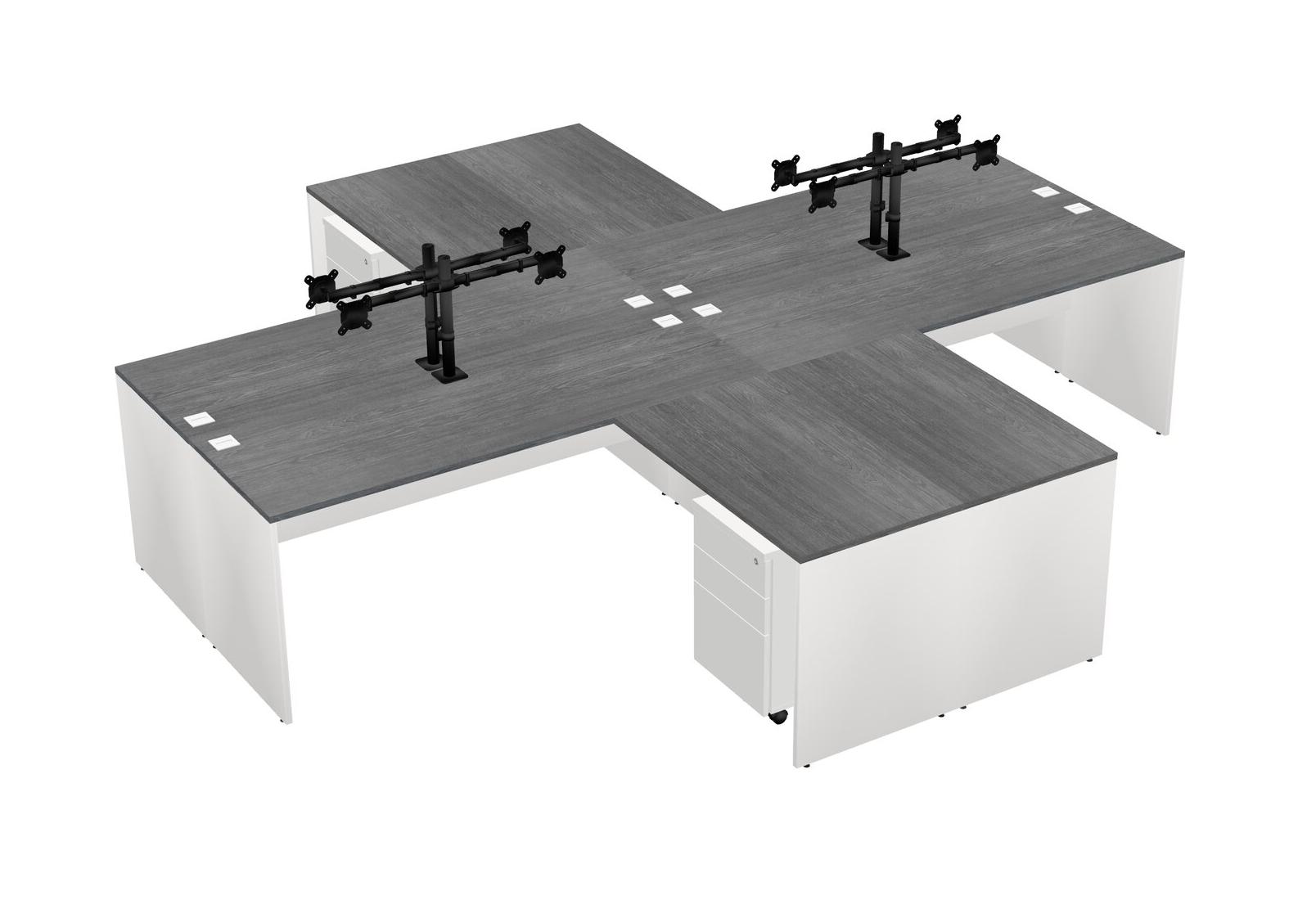 Grey Quad L-shaped Office Desks With Black Monitor Arm (double Arms)