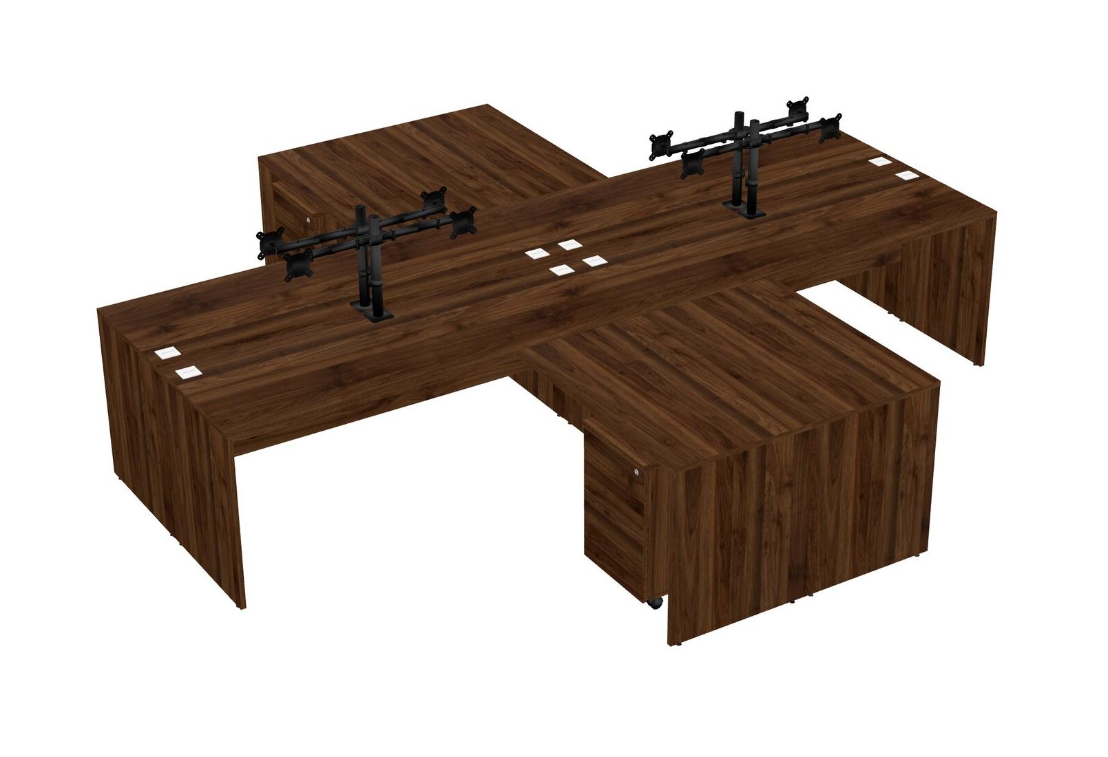 Columbia Walnut Quad L-shaped Office Desks With Black Monitor Arm (double Arms)