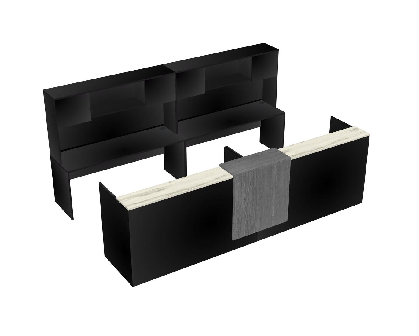 Modular Shared Reception Desk + Credenza Desk With Floating Counter + Hutch + Wooden Mobile Drawers