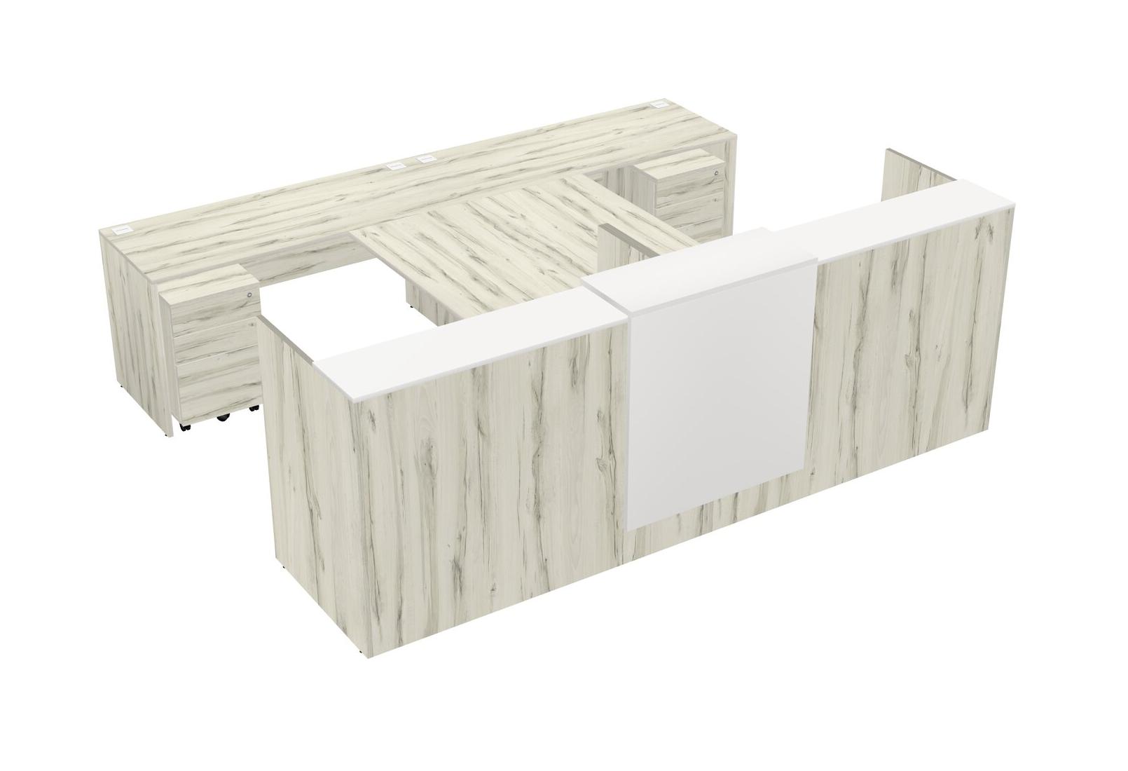 Modular Shared Reception Desk + Credenza Desk With Floating Counter + Wooden Mobile Drawers