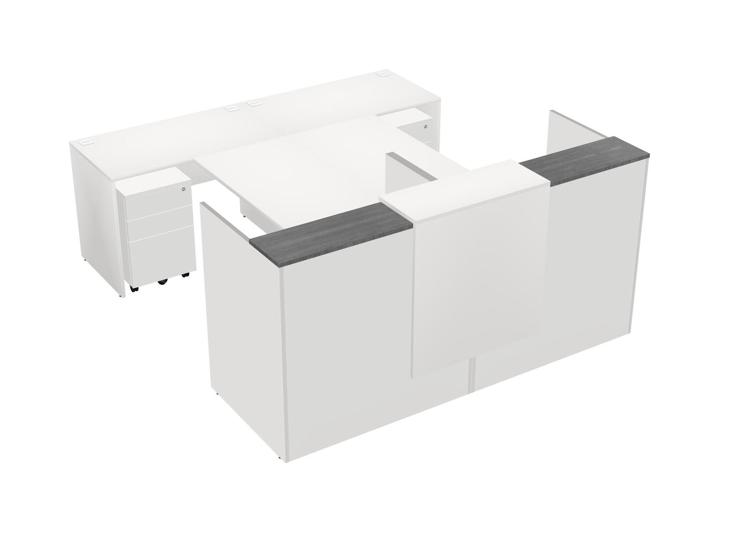 Modular Shared Reception Desk + Credenza Desk With Floating Counter + Wooden Mobile Drawers