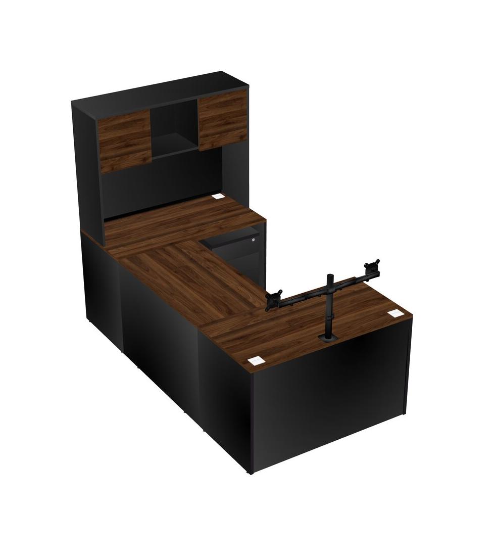 Office U-shaped Desk Credenza Desk + Wooden Mobile Drawers + Hutch + Monitor Arm (double Arms)