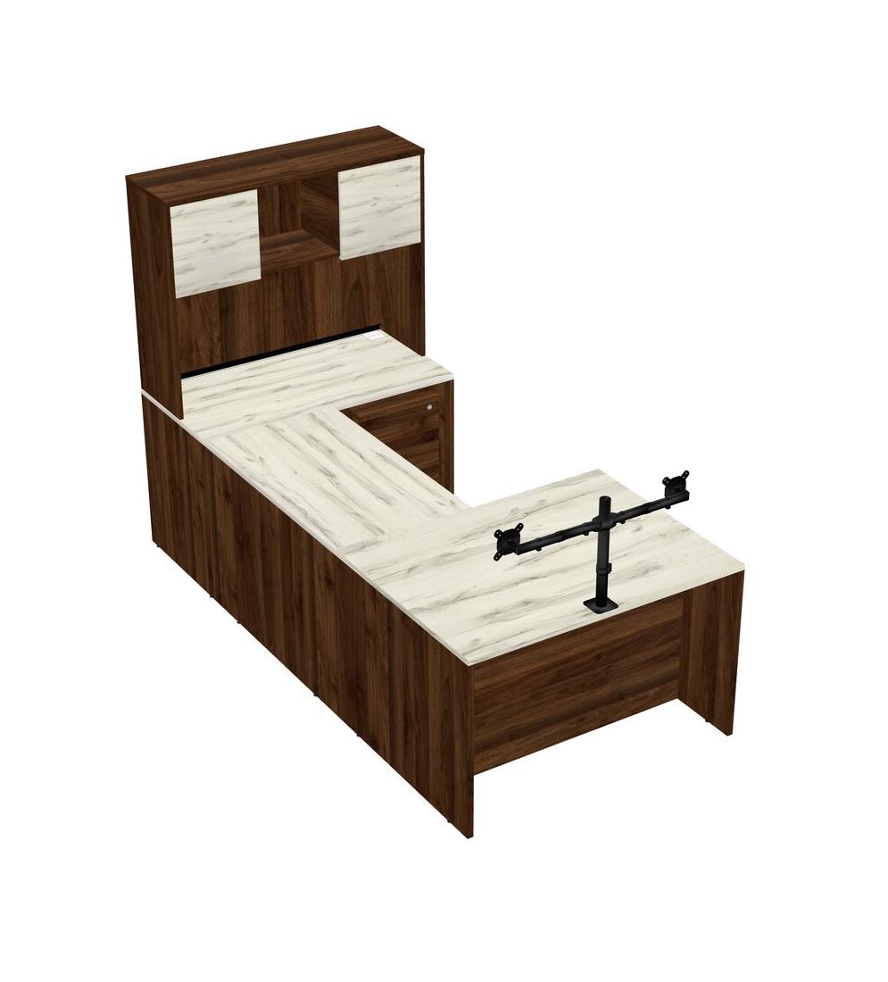 Office U-shaped Desk Credenza Desk + Wooden Mobile Drawers + Hutch + Monitor Arm (double Arms)