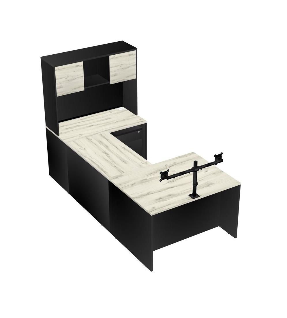 Office U-shaped Desk Credenza Desk + Wooden Mobile Drawers + Hutch + Monitor Arm (double Arms)