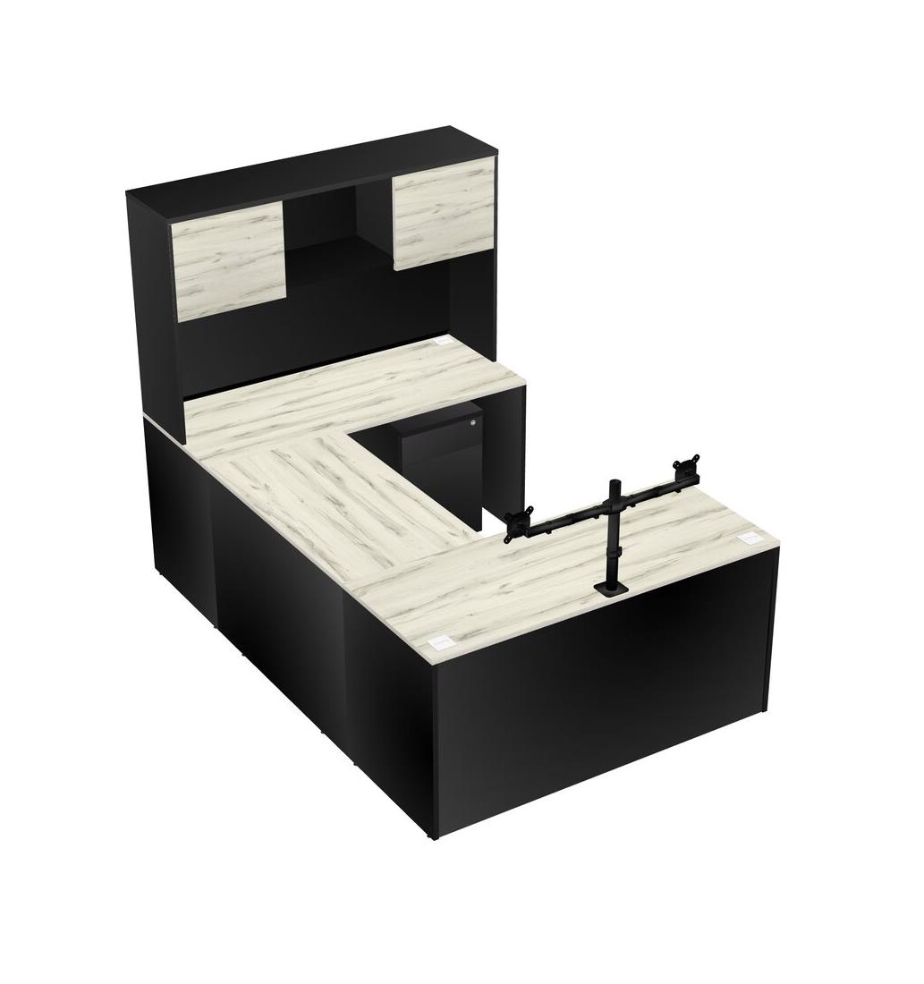Office U-shaped Desk Credenza Desk + Wooden Mobile Drawers + Hutch + Monitor Arm (double Arms)