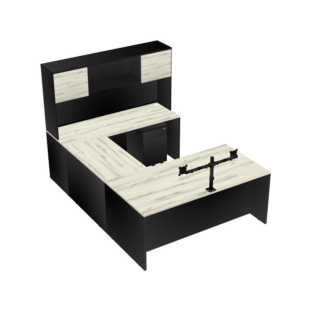 Office U-shaped Desk Credenza Desk + Wooden Mobile Drawers + Hutch + Monitor Arm (double Arms)