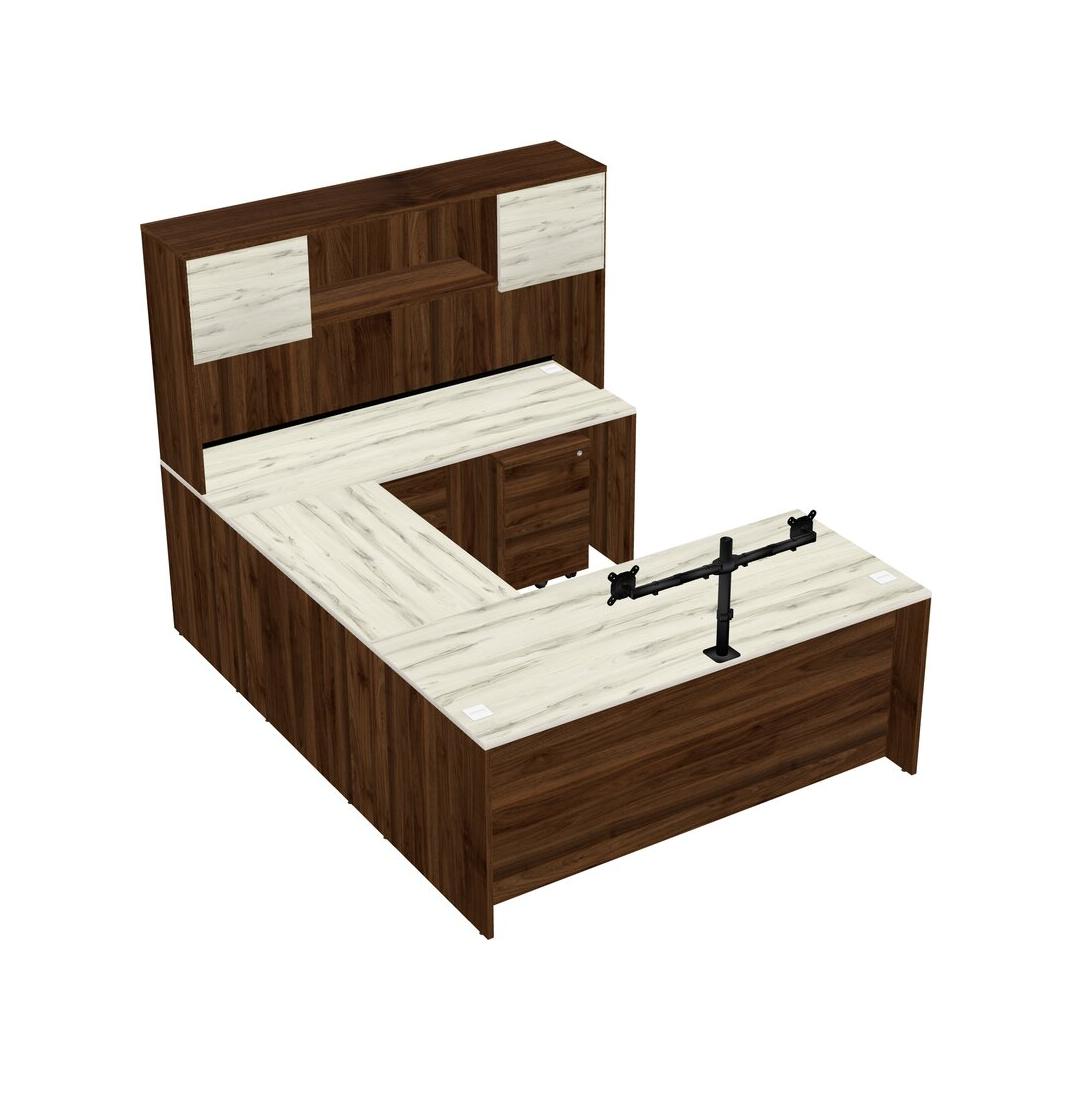 Office U-shaped Desk Credenza Desk + Wooden Mobile Drawers + Hutch + Monitor Arm (double Arms)