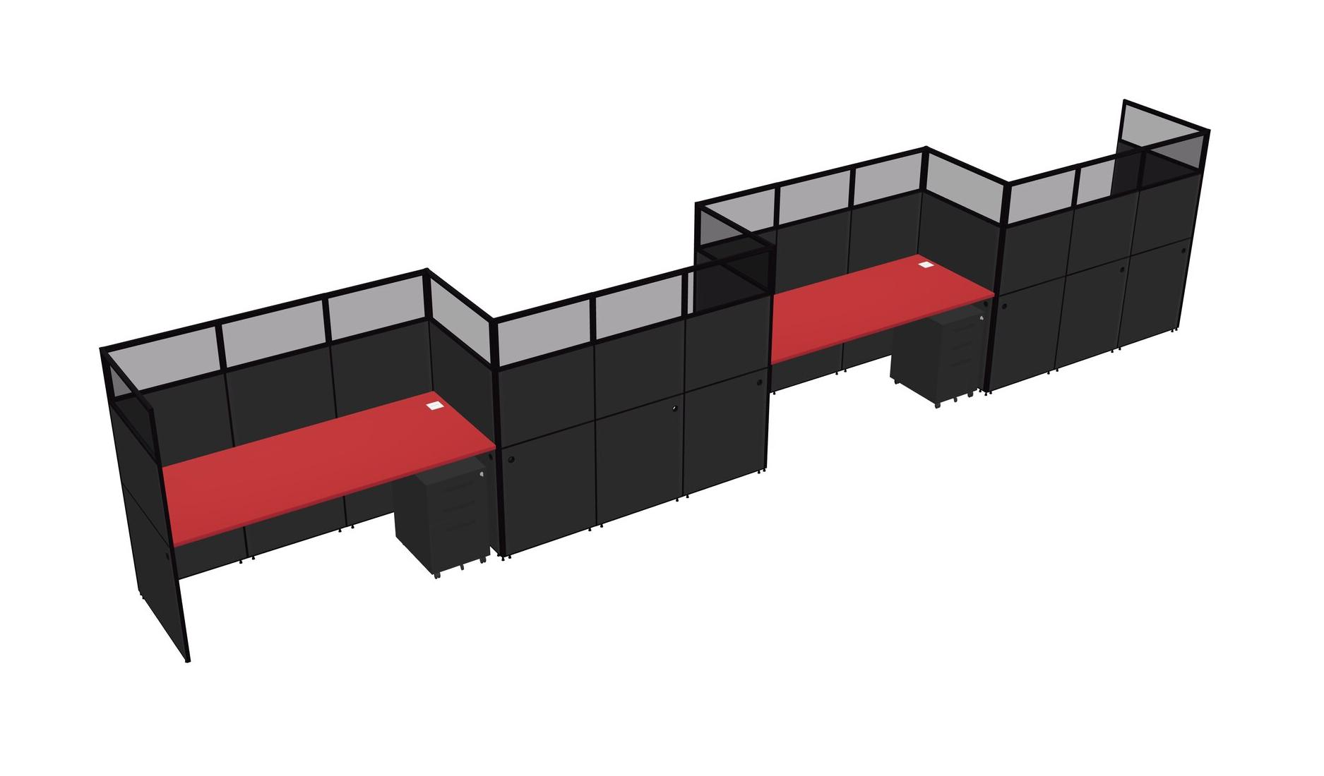 Prism Red Rectangular Cubicle Workstations For 4 - Zigzag Formation + Black Metal Mobile Drawers