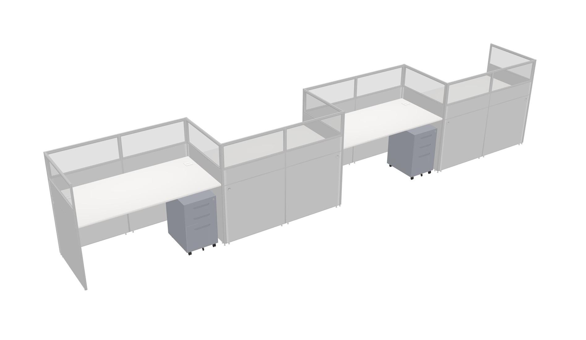 White Rectangular Cubicle Workstations For 4 - Zigzag Formation + Grey Metal Mobile Drawers