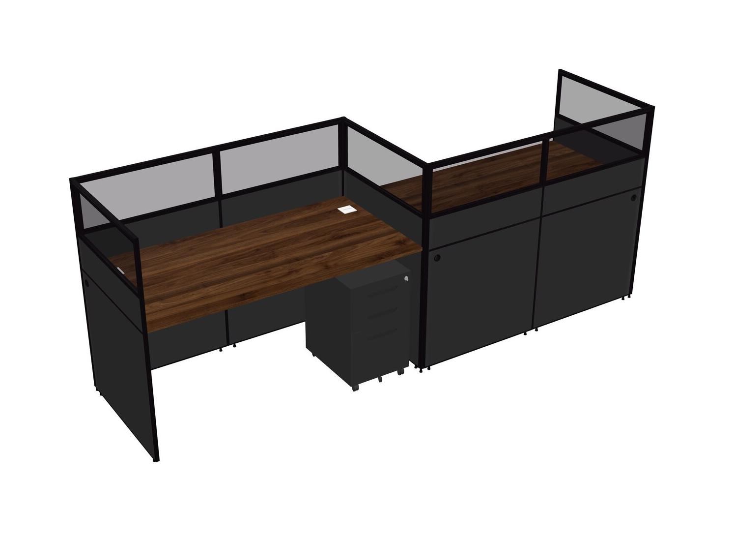 Columbia Walnut Rectangular Cubicle Workstations For 2 - Zigzag Formation + Black Metal Mobile Drawers