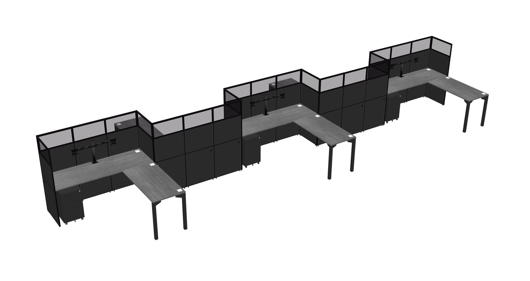 Grey L-shape Cubicle Workstations For 5 - Zigzag Formation + Black Metal Mobile Drawers + Panel Return