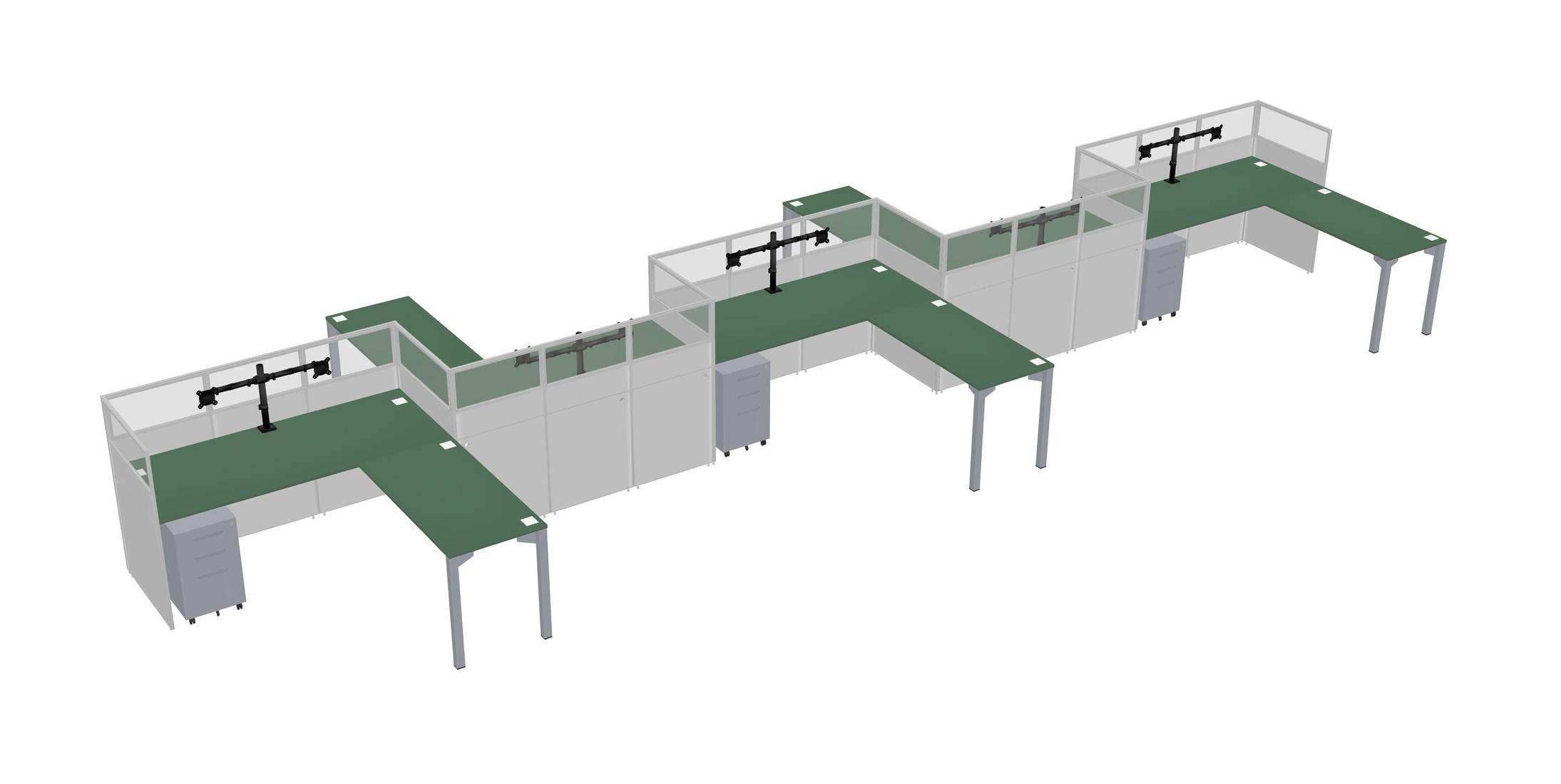 Green L-shape Cubicle Workstations For 5 - Zigzag Formation + Grey Metal Mobile Drawers + Panel Return