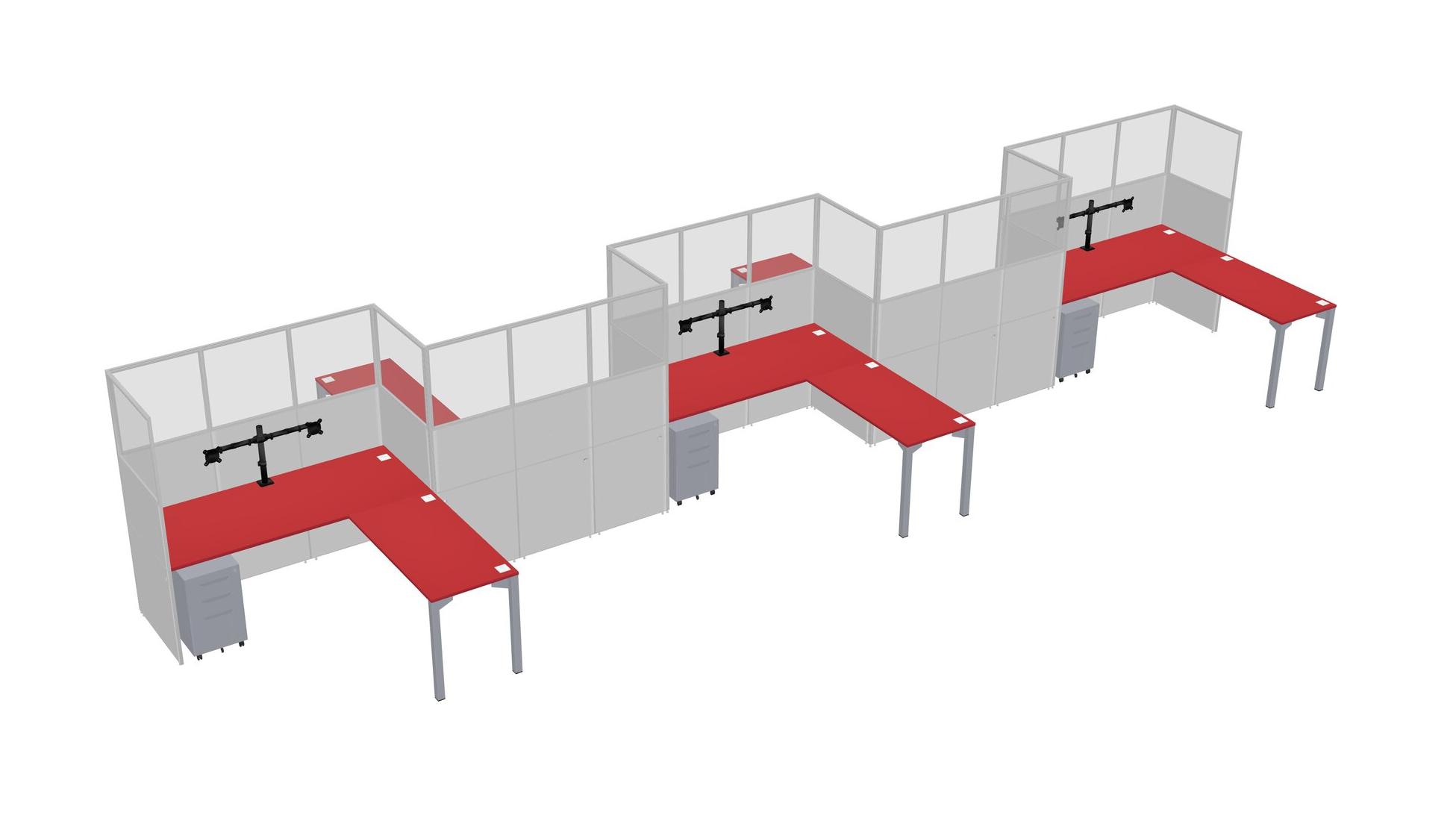 Prism Red L-shape Cubicle Workstations For 5 - Zigzag Formation + Grey Metal Mobile Drawers + Panel Return