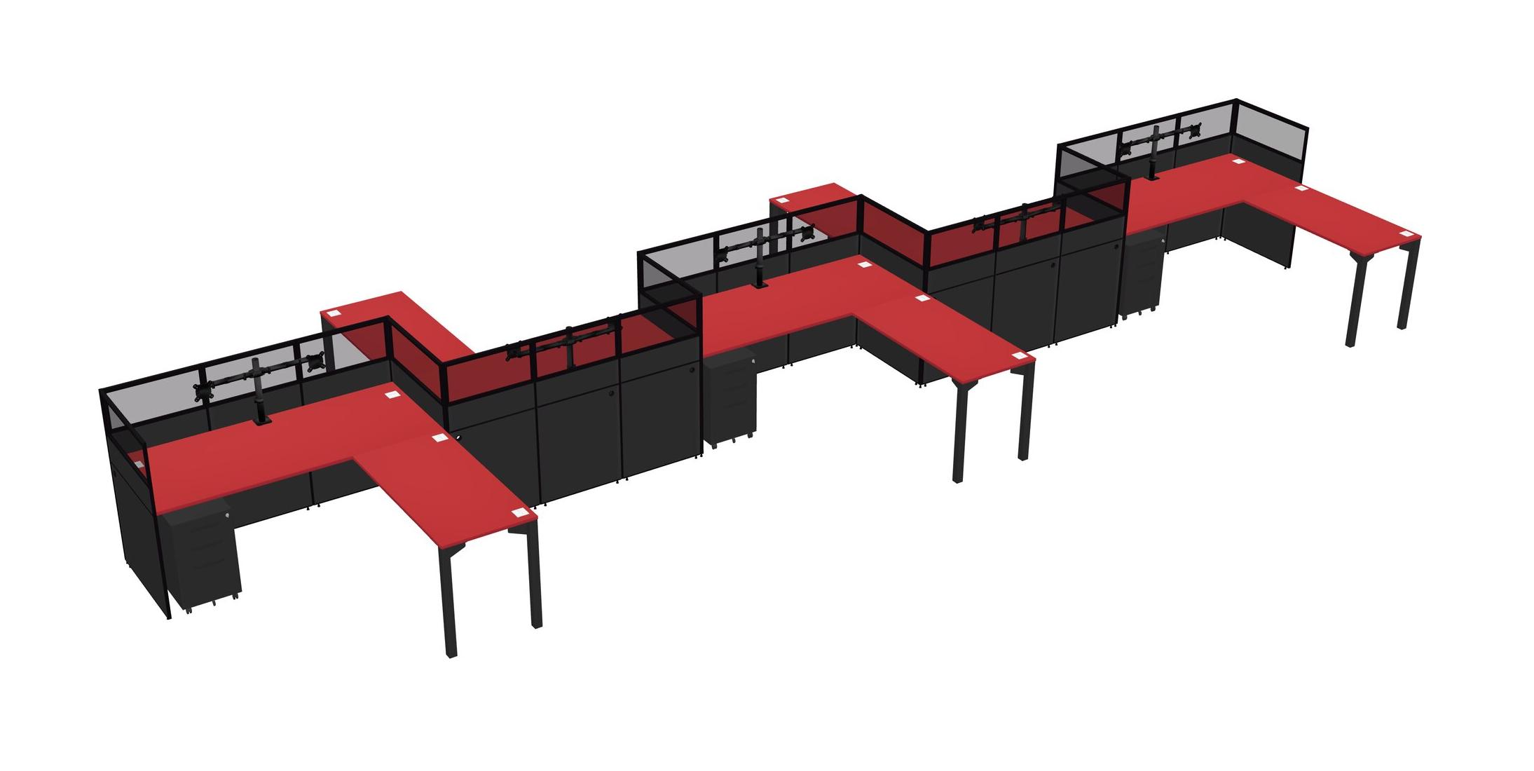 Prism Red L-shape Cubicle Workstations For 5 - Zigzag Formation + Black Metal Mobile Drawers + Panel Return