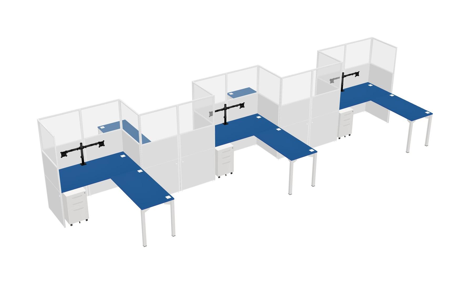 Prism Blue L-shape Cubicle Workstations For 5 - Zigzag Formation + White Metal Mobile Drawers + Panel Return