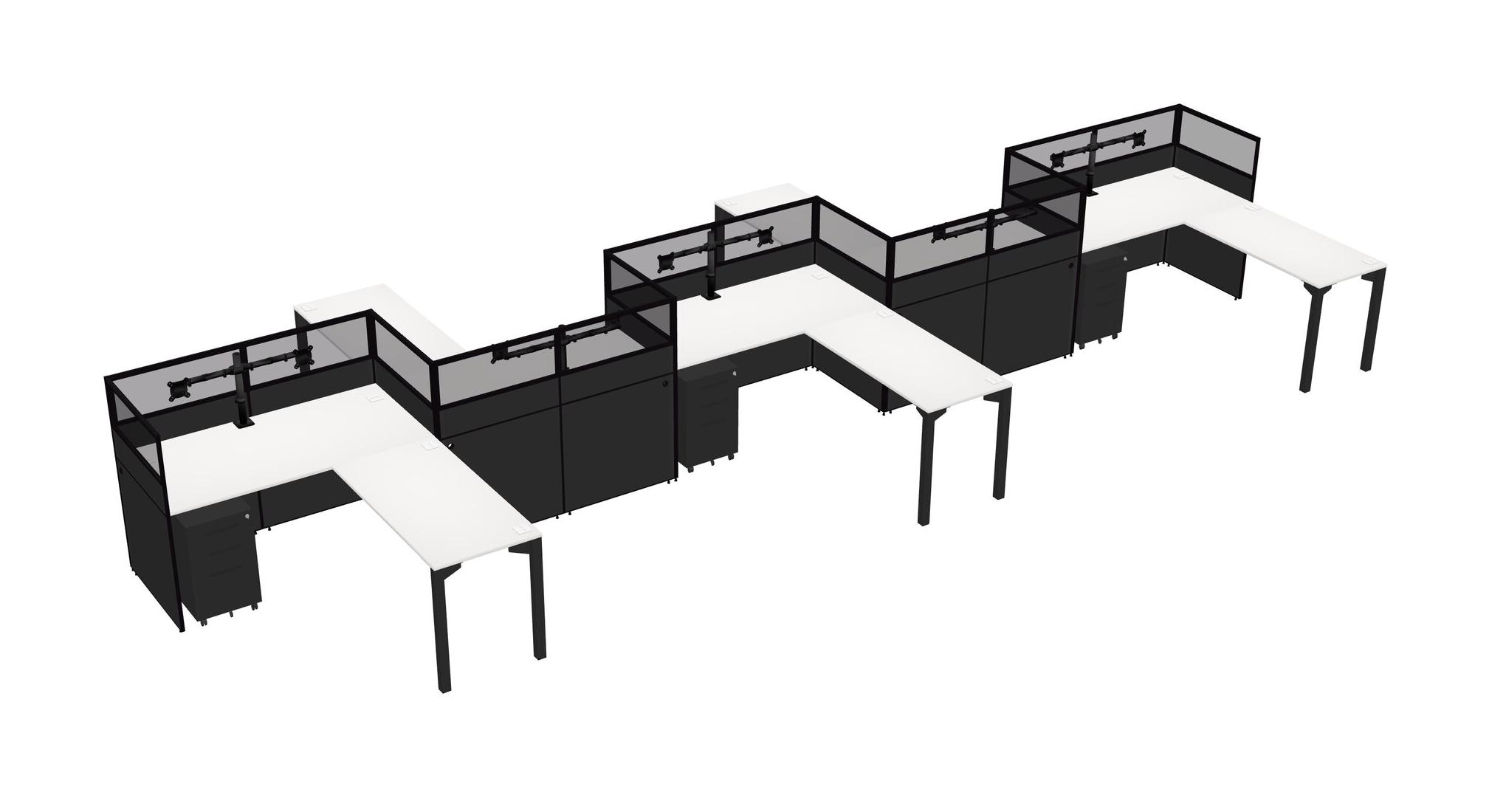 White L-shape Cubicle Workstations For 5 - Zigzag Formation + Black Metal Mobile Drawers + Panel Return