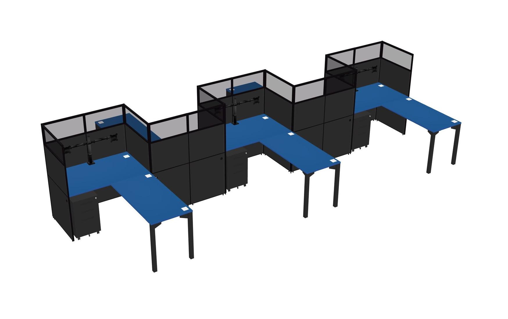 Prism Blue L-shape Cubicle Workstations For 5 - Zigzag Formation + Black Metal Mobile Drawers + Panel Return