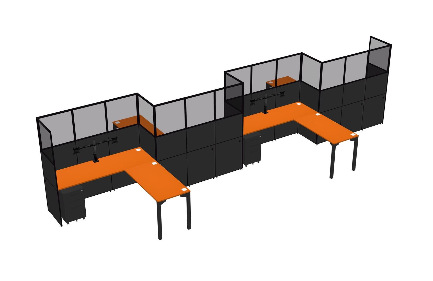 Orange L-shape Cubicle Workstations For 4 - Zigzag Formation + Black Metal Mobile Drawers + Panel Return