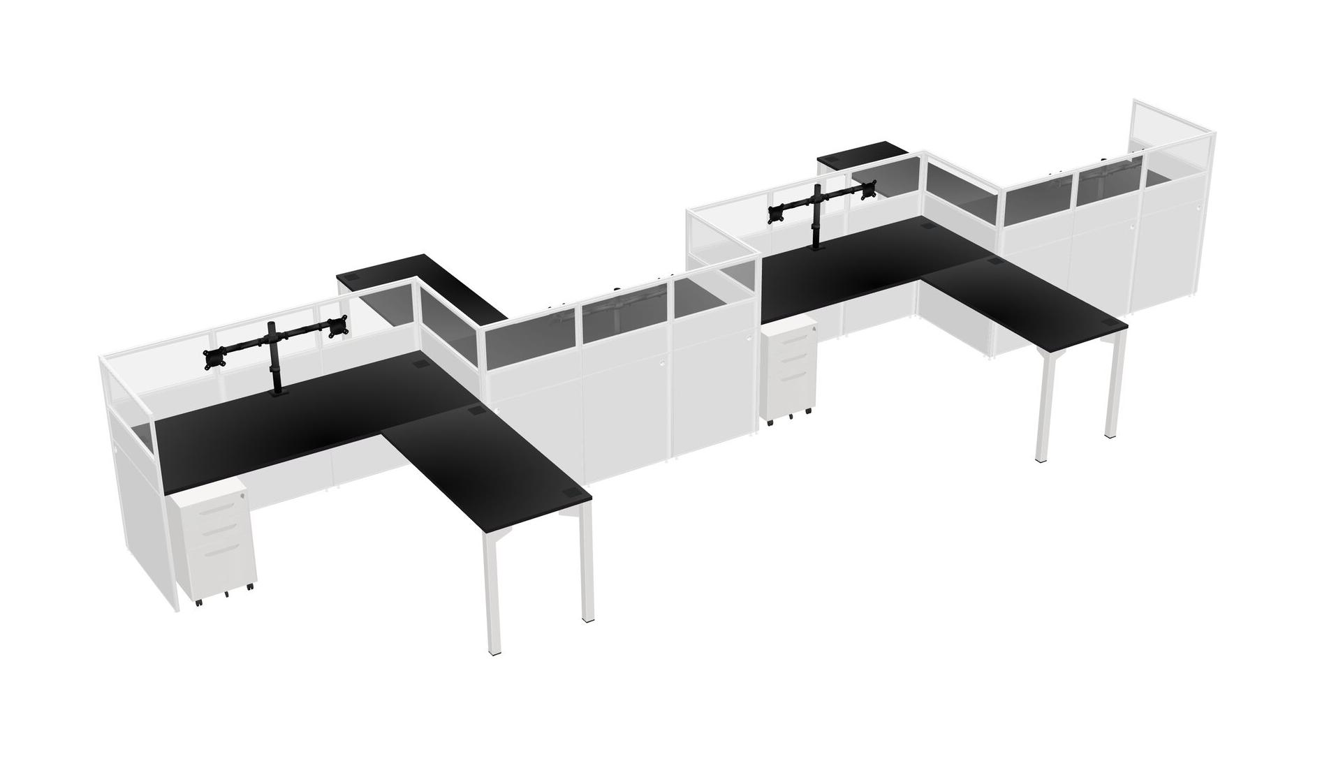 Black L-shape Cubicle Workstations For 4 - Zigzag Formation + White Metal Mobile Drawers + Panel Return