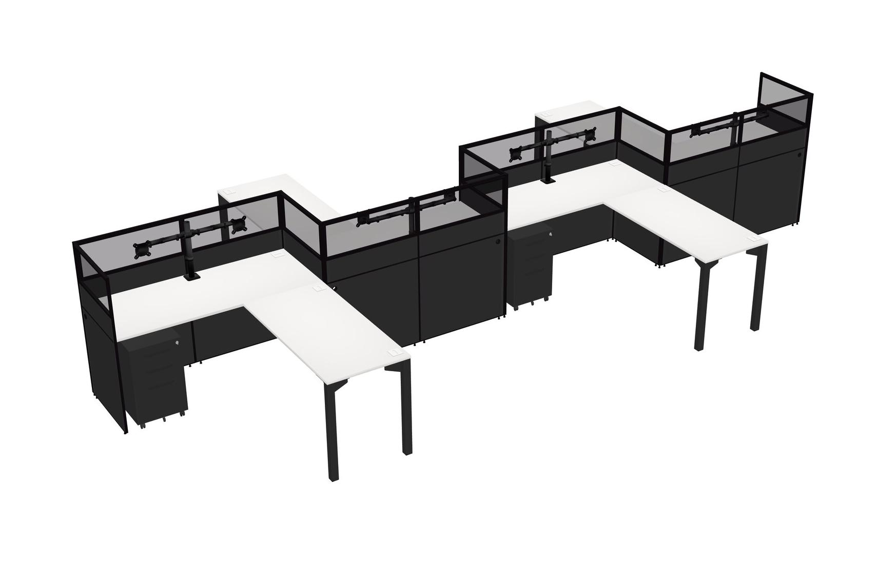 White L-shape Cubicle Workstations For 4 - Zigzag Formation + Black Metal Mobile Drawers + Panel Return