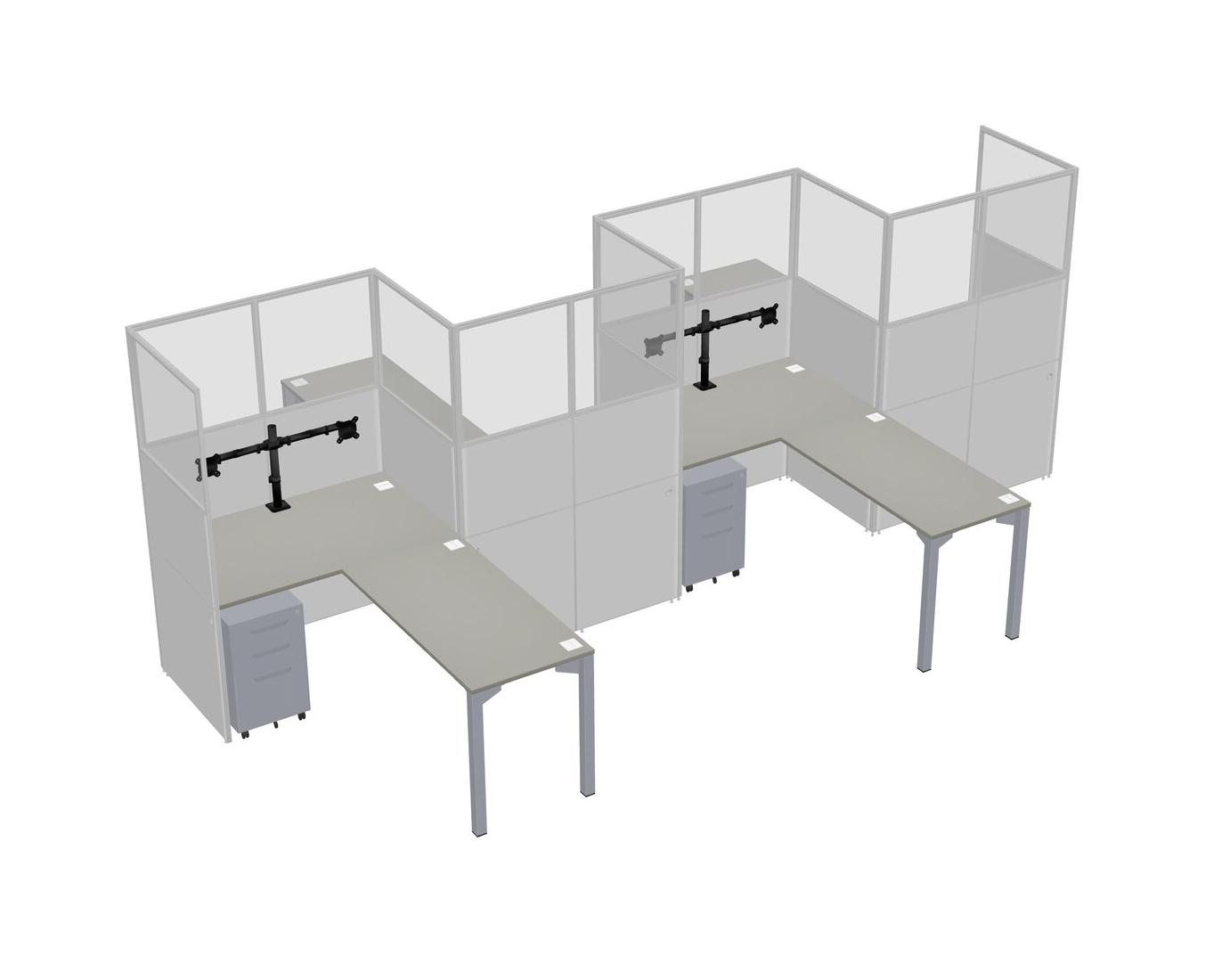 Grey Shadows L-shape Cubicle Workstations For 4 - Zigzag Formation + Grey Metal Mobile Drawers + Panel Return