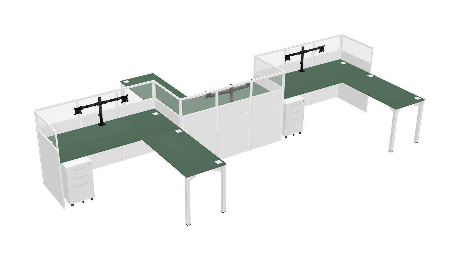 Green L-shape Cubicle Workstations For 3 - Zigzag Formation + White Metal Mobile Drawers + Panel Return