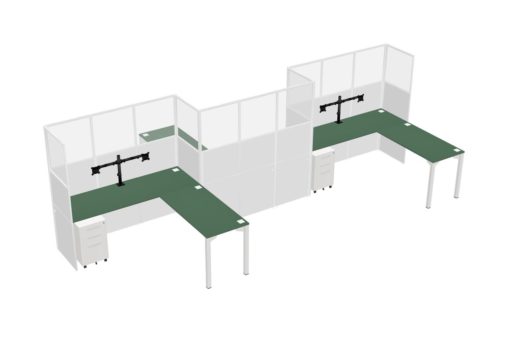 Green L-shape Cubicle Workstations For 3 - Zigzag Formation + White Metal Mobile Drawers + Panel Return