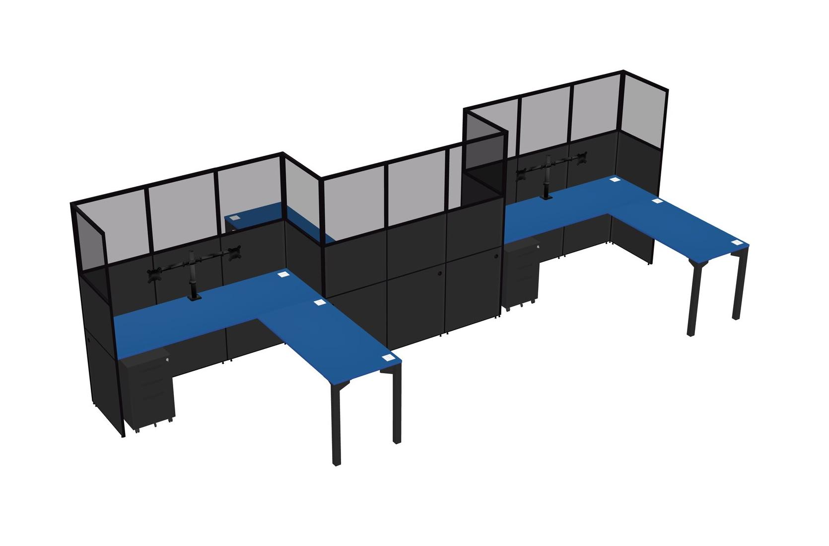 Prism Blue L-shape Cubicle Workstations For 3 - Zigzag Formation + Black Metal Mobile Drawers + Panel Return