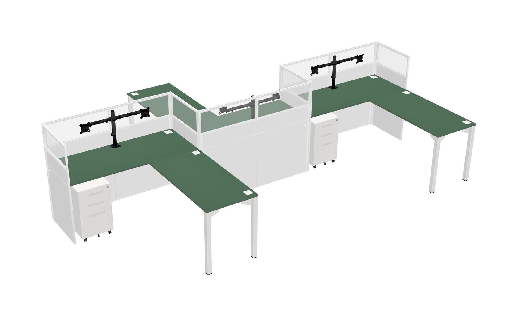 Green L-shape Cubicle Workstations For 3 - Zigzag Formation + White Metal Mobile Drawers + Panel Return