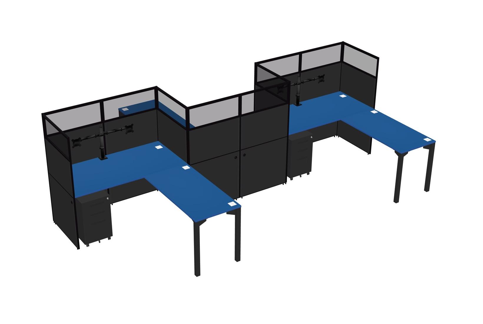 Prism Blue L-shape Cubicle Workstations For 3 - Zigzag Formation + Black Metal Mobile Drawers + Panel Return