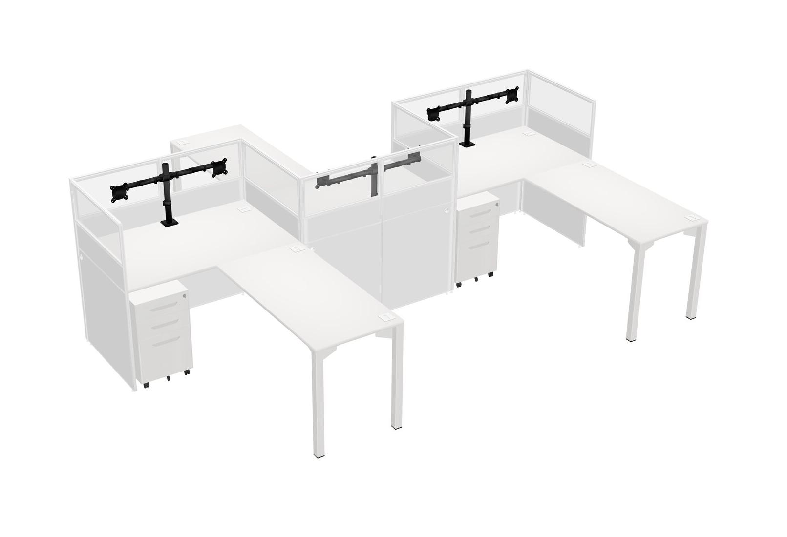 White L-shape Cubicle Workstations For 3 - Zigzag Formation + White Metal Mobile Drawers + Panel Return