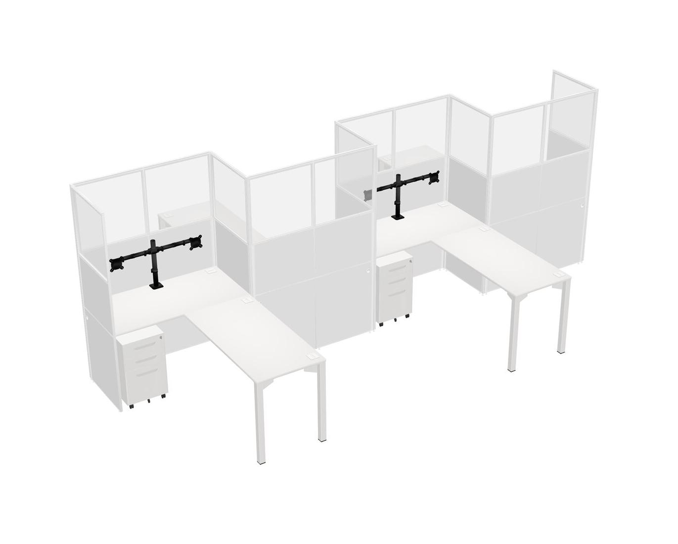 White L-shape Cubicle Workstations For 4 - Zigzag Formation + White Metal Mobile Drawers + Panel Return